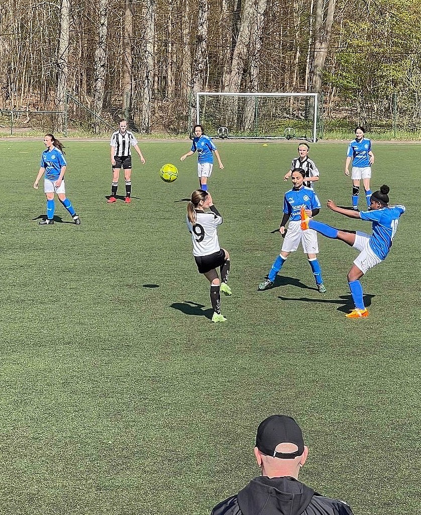 Några av tjejerna hoppar ibland in i damlaget. Senaste gjorde en av dem mål. Det ger gruppen lite självförtroende.