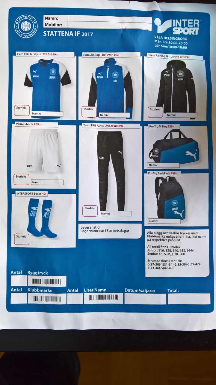 Om ni är intresserade av våra träningskläder så är det till Intersport på Väla ni skall vända er. I butiken har de kläder som ni kan prova så att ni får rätt storlekar. Ni fyller sedan i en lapp (vänligen se bild) och lämnar den till en av Intersports personal. Cirka 15 arbetsdagar senare kan ni hämta era kläder.