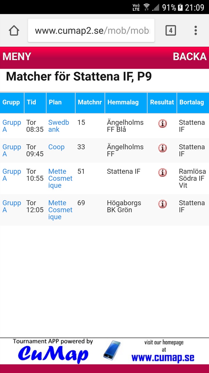 Samling klockan 07:00 på Stattena klubbhus för avfärd strax därefter. Första matchen startar kl 08:35.
